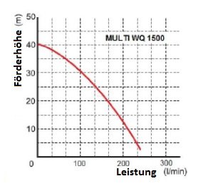 Pompa professionale per acque reflue con un'altezza di consegna di 40 m. Per solidi fino a 5 mm. Tipo: Multi WQ 1500 F. Tensione: 230V / 50Hz / 9A. Potenza: 1500W. Classe di protezione: IP68. Testa massima: 40 m. Pressione massima 4bar. Portata massima: 13800 l / h / 230 l / min. Collegamento: 2 "filetto femmina con bocchettone da 2". Altezza della pompa: 52,5 cm. Larghezza pompa con flangia di collegamento: 23,5 cm. Lunghezza del cavo: 10 m. Peso: circa 23,7 kg.