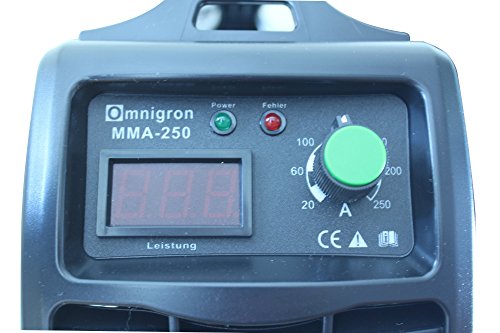 Omnigron, saldatrice elettrica MMA-250 da 250 A, saldatore con inverter CC, display LCD digitale, 1 fonte di alimentazione da 250 A, 1 cavo di messa a terra con morsetto per messa a terra di alta qualità, 1 portaelettrodo, 1 schermo di protezione per le mani, 1 martello demolitore con spazzola, 1 cinghia di trasporto e 1 manuale di istruzione in lingua tedesca (lingua italiana non garantita)