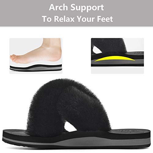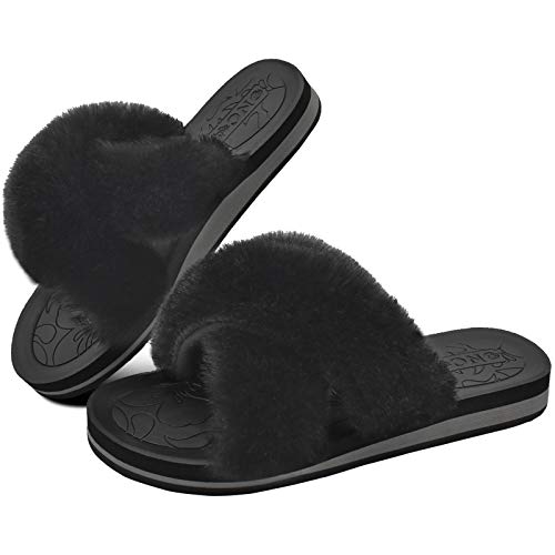 ONCAI Nero Pantofole con Pelo Donna Moda Punta Aperta Ciabatte da Casa Pelose Banda Incrociata Supporto per Arco Peluche Sandali Invernali con Tappetino Yoga Taglia 40