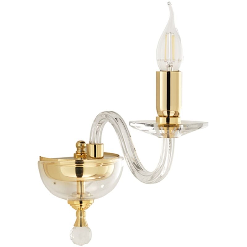 Lampada da parete PAGANINI realizzata in vetro lavorato a mano con dettagli in cristallo ottico e finiture in metallo. Un elemento dalle linee semplici ma raffinate, ideale per illuminare e al tempo stesso arredare con eleganza salotti, ingressi e soggiorni contemporanei o classici. Applique PAGANINI a 1 LUCE in vetro lavorato a mano. CARATTERISTICHE Colore: Oro Materiale: Vetro, metallo Tipologia: Applique Modello: 1 luce Altezza: 30 cm Larghezza: 12 Profondita': 27 cm Dimmerabile: NO Illuminazione: 1 x E14 (L'attacco E14 permette di installare lampadine a LED, fluorescenti o alogene non incluse). Input: 220-230V