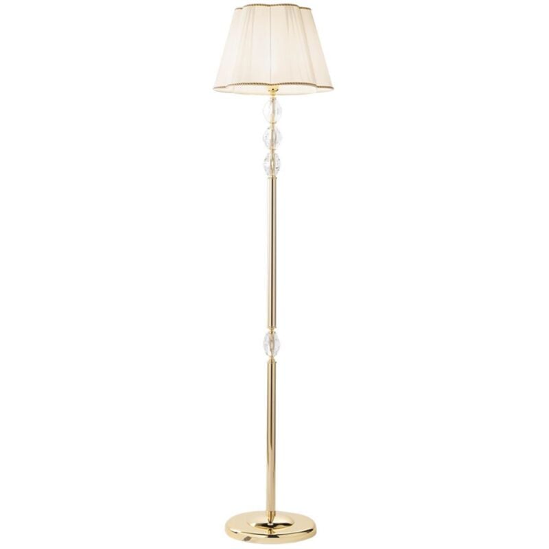 Piantana BRIGIDA in cristallo e vetro trasparente finitura oro La piantana BRIGIDA e' realizzata interamente in vetro trasparente e cristallo con montatura in metallo finitura oro e paralume in tessuto avorio. Impreziosita da quattro elementi a forma di rombo realizzati in cristallo molato;