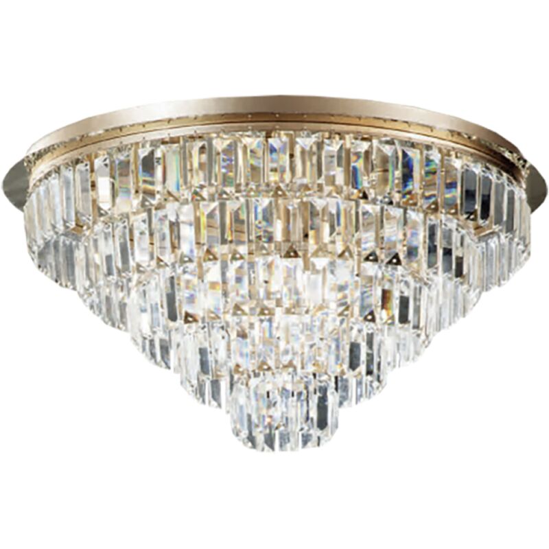 Lampada plafoniera elegante CASTLE con base in metallo e pendenti in cristallo. Crea un gioco di luce in qualsiasi ambiente venga posizionata. 16 luci con portalampade attacco G9. La plafoniera CASTLE e' composta da una base a soffitto rotonda in metallo,dal quale pendono varie barrette in cristallo,andando a creare un magnifico gioco di luci. Dal design elegante,sara' perfetto per il salone o il soggiorno,o per arredare la camera da letto o l'ufficio. CARATTERISTICHE Colore: Oro Materiale: Metallo e cristallo Tipologia: Plafoniera Diametro: 80 Altezza: 36 cm Dimmerabile: NO Illuminazione: 16xG9 MAX 33W (L'attacco G9 permette di installare lampadine a LED, fluorescenti o alogene) Lampadina non incluse Input: 220-230V