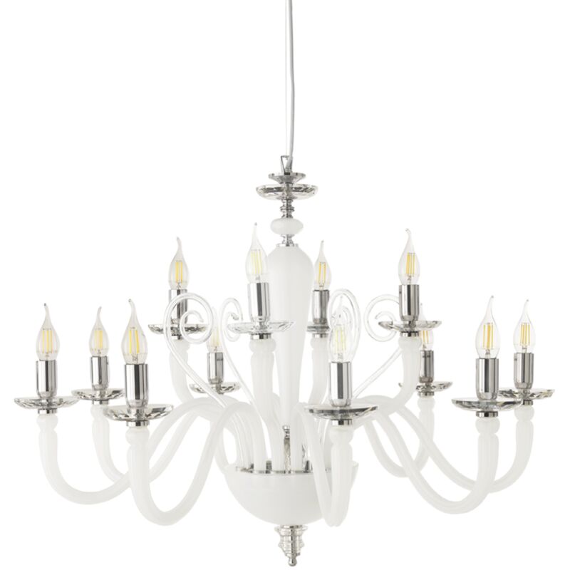 Lampadario DEBUSSY realizzato in vetro lavorato a mano con dettagli in cristallo ottico e finiture in metallo cromato. Cavetti in acciaio regolabili in altezza. Un elemento dalle linee eleganti, ideale per illuminare e al tempo stesso arredare ingressi, salotti e soggiorni contemporanei. CARATTERISTICHE Colore: Bianco Materiale: Vetro, metallo Tipologia: Lampada a sospensione Modello: 12 luci Altezza max: 220 cm Diametro: 84 cm Dimmerabile: NO Illuminazione: 12 x E14 (L'attacco E14 permette di installare lampadine a LED, fluorescenti o alogene non incluse). Input: 220-230V