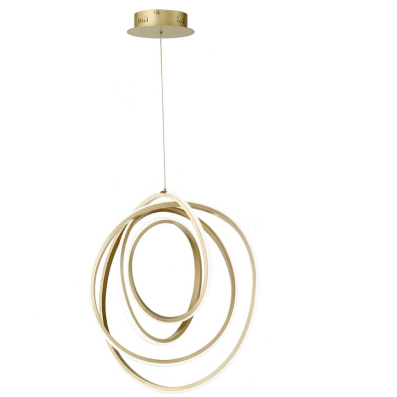 Lampada a sospensione GOLDEN in metallo verniciato oro a LED La sospensione GOLDEN e' realizzata interamente in metallo verniciato oro con sorgente luminosa Led integrata dimmerabile. Cavetti regolabili in lunghezza. Gli anelli concentrici fluttuano nell'aria sprigionando una luce calda e accogliente. Un lampadario dal design accattivante e moderno, perfetto per arredare e illuminare ogni spazio della vostra casa con un tocco di originalita'. Modello: GRANDE Dimensioni: Diametro 50 x Altezza 200 CM;