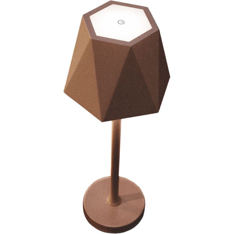 Lampada da tavolo FIJI a LED ricaricabile tramite cavo USB. Pratico sistema touch per dimmerare la luce,accendere e spegnere la lampada. Autonomia di 8 ore con il 100% di intensita' luminosa. La lampada e' dotata di sorgente led integrata con colore luce 3000K, bianco calda. La lampada FIJI a LED e' perfetta per arredare ambienti esterni o interni e grazie al grado di protezione IP54 non teme pioggia e agenti atmosferici. Pratica nel trasporto date le sue dimensioni contenute e l'assenza di fili,puo' essere utilizizzata per ristoranti,locali pubblici,attivita' commerciali,sale ricevimento o giardini. CARATTERISTICHE Colore: Corten Materiale: Alluminio/ABS Struttura: Alluminio - Diffusore: ABS Tipologia: Lampada da tavolo Diametro: 12 cm Altezza: 38 cm Dimmerabile: Si Touch: Si Illuminazione: LED integrato Potenza: 3W 240-300 LM Input: 220-230V Colore luce: 3000K Grado di protezione: IP54 Batteria ricaricabile tramite cavo Micro-USB Durata in base alla luminosita': 8/48 ore