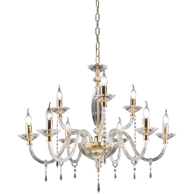 Lampadario a sospensione FIAMMA realizzato in cristallo e vetro trasparente con finitura oro. Un elemento dalle linee raffinate, ideale per illuminare e al tempo stesso arredare con eleganza salotti e soggiorni contemporanei. CARATTERISTICHE Colore: Oro Materiale: Metallo, vetro Tipologia: Lampada a sospensione Modello: 9 luci Altezza max: 135 cm Diametro: 85 cm Dimmerabile: No Illuminazione: 9 x E14 ( L'attacco E14 permette di installare lampadine a LED, fluorescenti o alogene non incluse ) Input: 220-230V