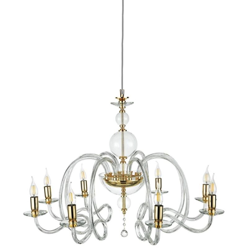 Lampadario a sospensione VIVALDI a 8 luci in vetro lavorato a mano Il lampadario a 8 luci VIVALDI e' realizzato in vetro lavorato a mano con dettagli in cristallo ottico e finiture in metallo dorato.Cavetti in acciaio regolabili in altezza. Un elemento dalle linee tondeggianti e raffinate, ideale per illuminare e al tempo stesso arredare con particolare eleganza salotti, camere da letto e soggiorni contemporanei. Colore: Trasparente/oro Dimensioni: Diametro 88 cm / Altezza MAX 140 cm Illuminazione: 8xE14 L'attacco E14 permette di installare lampadine a LED, fluorescenti o alogene (non incluse).