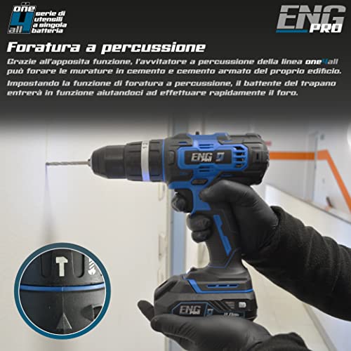 Kit ONE4ALL 2 Batterie 2.0Ah Trapano Avvitatore A Percussione A Batteria Mandrino Autoserrante 13mm + Smerigliatrice Angolare Con Disco Da 125 mm Con Accessori - ENG PRO