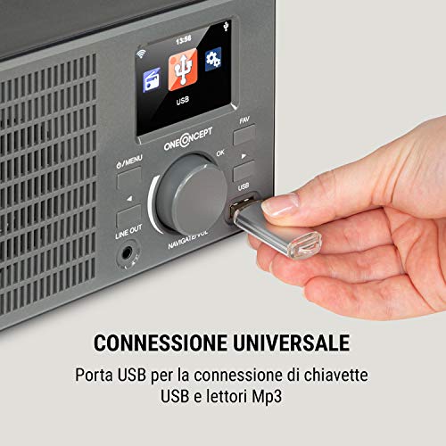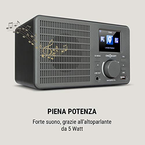 OneConcept TuneUp - Web Radio, Interfaccia Wi-Fi, Internet Radio, Potenza: 5 Watt, App-Control con AirMusic App, Uscita Line, HCC Display da 2,4" (High Contrast and Color), Grigio Scuro