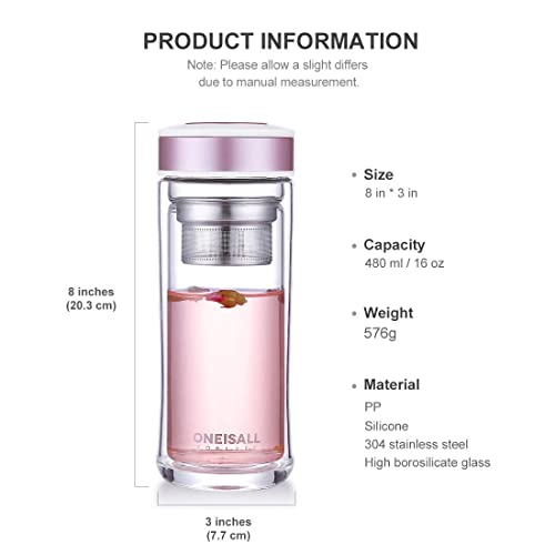 Oneisall - Bicchiere da tè con doppia parete in vetro, tazza da viaggio - Bicchiere con recipiente per infusione per tè, thermos con colino, borraccia sportiva per casa e lavoro, Rose Gold, 480ML