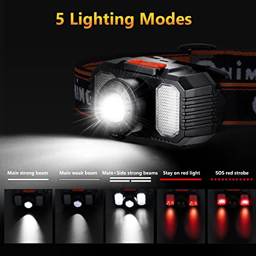 5 modalità di illuminazione: la torcia a LED Onimoy è appositamente progettata con un fascio di luce principale principale a LED zoomabile e 2 fascio laterale COB, dispone di 5 modalità di illuminazione: Faretto principale ad alto faro/principale debole faro/ampio proiettore (principale+luci laterali accese)/luce rossa/luce stroboscopica rossa, soddisfare diverse esigenze di illuminazione.