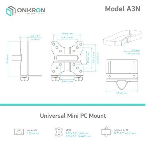 ONKRON Supporto per Mini PC (Intel NUC, Mac Mini ECC.) Fino a 5 kg, Montaggio su Supporto Monitor o VESA, Larghezza variabile, Acciaio, Nero A3N
