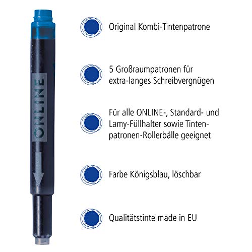 ONLINE 17036/12 Cartuccia d'inchiostro Combi, colore inchiostro blu reale, 1 confezione da 5 cartucce, per penne stilografiche e roller standard