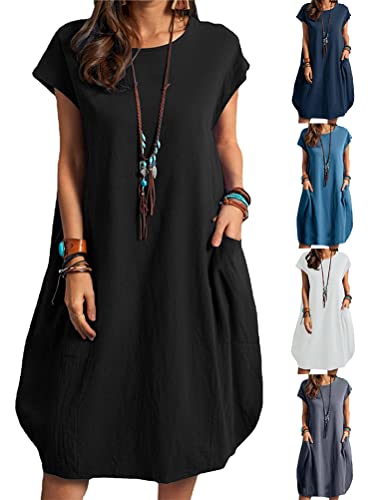 Onsoyours Abito Estivo da Donna in Cotone con Maniche a Rullo con Bottoni Tinta Unita Vintage Etnico in Cotone e Lino Scollo Rotondo Maniche Corte A Grigio XL