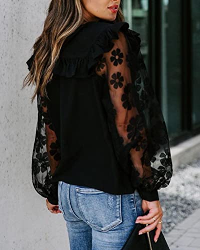 Onsoyours Blusa Donna Camicia Top in Pizzo Elegante Vintage a Maniche Lunghe Collo Alto a Sbuffo Trasparente per Primavera/Autunno C Nero L