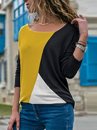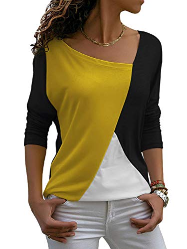 Onsoyours Camicetta Donna Manica Lunga Blusa Donna Taglie Forti T-Shirt Tops Patchwork Colore Pullover Scollo a V Asimmetrico Color Block Tops Giallo 44