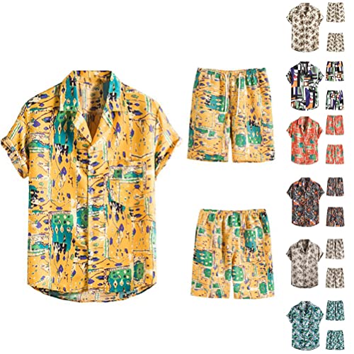 Onsoyours Tute Uomo Estive 2 Pezzi Hawaiana Camicia da Spiaggia Casual Lino Manica Corta Maglietta + Pantaloncini con Elastico in Vita Set Tute Completa Sportive C Giallo S