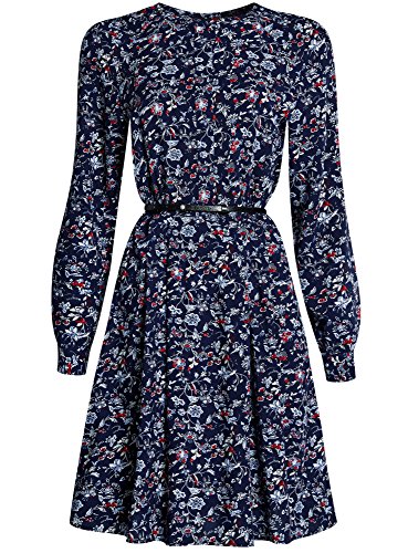 Oodji Collection Donna Abito in Viscosa con Cintura, Blu, IT 46 / EU 42 / L