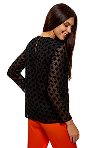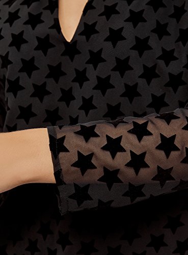 Oodji Collection Donna Camicetta con Scollo Decorativo e Stampa Floccata, Nero, IT 42 / EU 38 / S