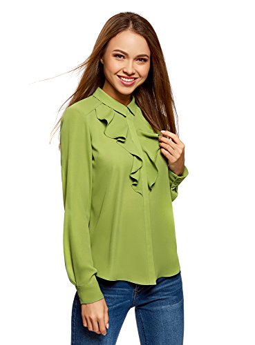 Oodji Collection Donna Camicetta in Tessuto Fluido con Volant, Verde, IT 40 / EU 36 / XS