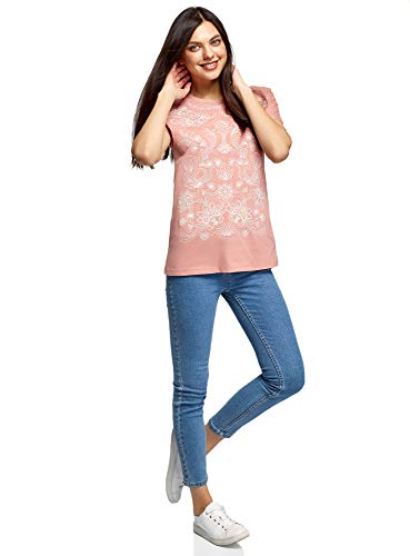 Oodji Collection Donna T-Shirt in Cotone con Ricamo, Rosa, L