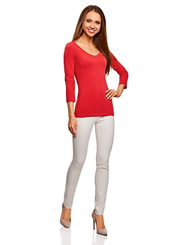 Oodji Collection Donna T-Shirt con Scollo a V e Maniche a 3/4, Rosso, IT 38 / EU 34 / XXS