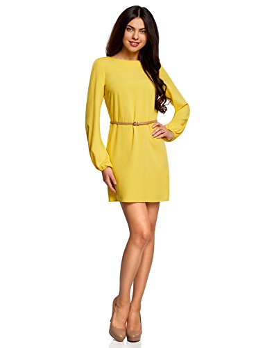 Oodji Ultra Donna Abito Basic in Viscosa con Cintura, Giallo, IT 46 / EU 42 / L