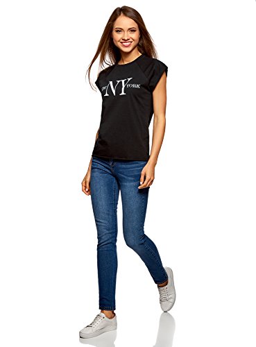 Oodji Ultra Donna T-Shirt in Cotone con Scritta e Orlo Grezzo, Nero, IT 44 / EU 40 / M