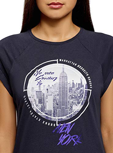 Oodji Ultra Donna T-Shirt in Cotone con Stampa e Orlo Grezzo, Blu, XS