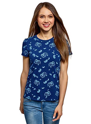 Oodji Ultra Donna T-Shirt Stampata con Scollo Rotondo, Blu, S