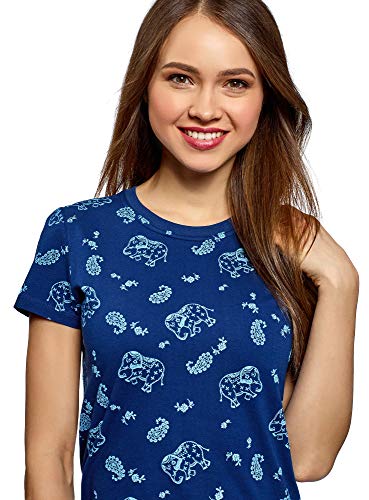 Oodji Ultra Donna T-Shirt Stampata con Scollo Rotondo, Blu, XS