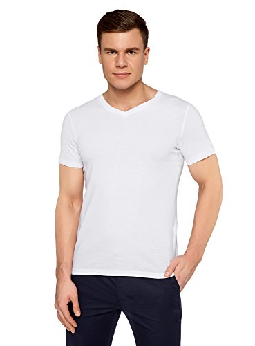 Oodji Ultra Uomo T-Shirt Basic con Scollo a V, Bianco, IT 44-46 / EU 46-48 / S