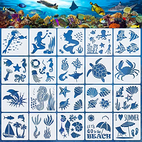 OOTSR 20 Pezzi Stencil per Pittura Muro Riutilizzabile, Stencil Decorativi per Pareti Plastica, Stencil Oceano e Spiaggia per Bambini, per Muro Legno Tessuto Scrapbooking DIY, 15x15cm