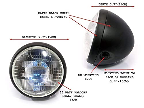 MISURE VINTAGE: diametro: 190mm / profondità: 170mm / punto di montaggio sul retro dell'alloggiamento: 100mm. Lente in vetro e interni in metallo per un faro di qualità. Il rivestimento è in acciaio nero opaco