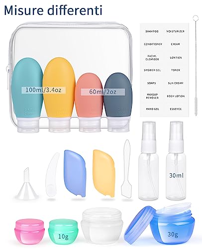 Set di flaconi da viaggio All-in-One - 18 pezzi in totale, 2 flaconi comprimibili in silicone da 100 ml e 2 da 60 ml, 2 flaconi spray, 4 vasetti di diverse dimensioni, 2 coprispazzolini in silicone, 4 piccoli attrezzi, 1 etichette e 1 borsa trasparente per il trasporto