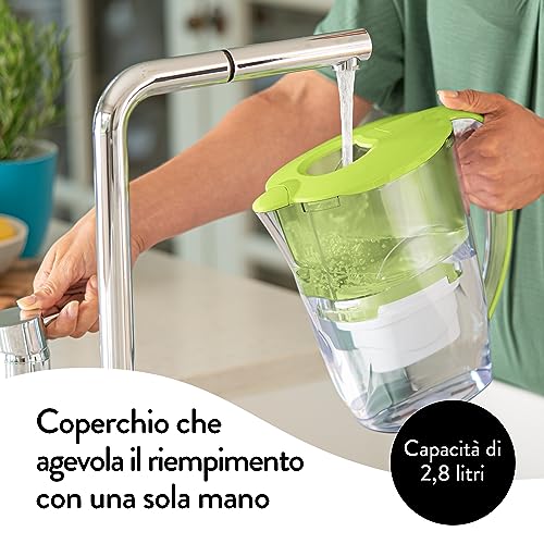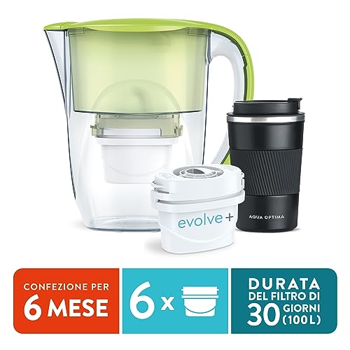 Aqua Optima Oria Water Filter Jug & 6 x 30 Day Evolve+ Filter Cartridge 2.8 Litre Capacity, and 380ml Travel Mug, for Reduction of Microplastics, Chlorine, Limescale and Impurities, Green