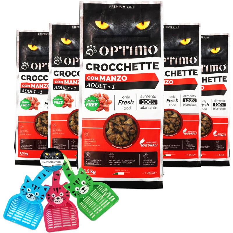 Optimo Premium Line ha creato un set esclusivo di crocchette per gatti. perfetto per garantire una dieta bilanciata e gustosa al tuo amico felino. Questo set include 5 pacchi di crocchette al gusto manzo. per un totale di 7.5 kg. arricchite con vitamine e minerali essenziali. Inoltre. riceverai una simpatica paletta per lettiera assortita. per una pulizia facile e veloce. Gusto Manzo: Le crocchette sono al gusto manzo. irresistibile per i gatti. Vitamine e Minerali: Arricchite con vitamina D. ferro e proteine per il benessere del tuo gatto. Formato Conveniente: 5 pacchi da 1.5 kg ciascuno. per un totale di 7.5 kg. Paletta per Lettiera Inclusa: Una simpatica paletta assortita per una pulizia pratica. Qualità Premium: Realizzate con ingredienti di prima scelta per una dieta equilibrata. Optimo Premium Line è sinonimo di qualità e attenzione al benessere del tuo gatto. Con questo set. non solo garantirai un'alimentazione sana e gustosa. ma avrai anche un accessorio utile per la gestione