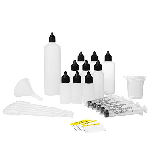 Set gigante contenuto: 3 x bottiglie da 30 ml, 3 x bottiglie da 50 ml, 3 x bottiglie da 100 ml, 1 x bottiglia da 250 ml, 1 x misurino da 50 ml, 1 x imbuto, 5 x siringhe da 10 ml, 5 x pipette da 3 ml, 10 x etichette scrivibili.