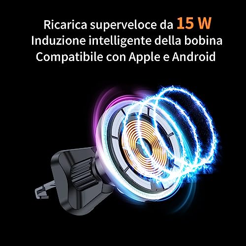 Oramkyo Caricabatterie Wireless Magnetico per Auto 15W per Cellulare, Mag-safe Compatibile con iPhon15/ 14/13/12 Series, Caricabatterie Wireless Magnetico per Auto per Presa d'Aria Cruscotto