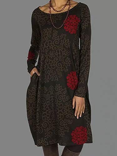 ORANDESIGNE Abito da Donna in Stile Etnico Vintage Abito Tunica Lunga con Stampa Girocollo Manica Lunga Vestito a Trapezio al Ginocchio C caffè L