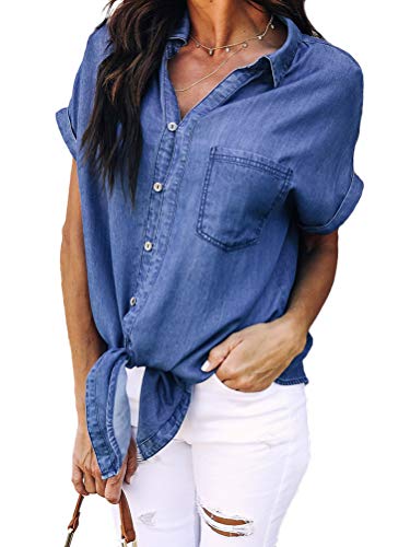 ORANDESIGNE Donna Camicia Jeans a Manica Lunga Camicetta Blusa Elegante Scollo V Denim Camicetta Jean Shirts Bavero Elegante Bluse Tops E Blu Scuro S