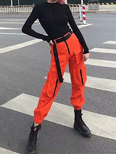 ORANDESIGNE Donna Pantaloni Basic Casual con Multi Tasche Cargo Pantalone da Lavoro Moda Baggy Hip Hop per Trekking Joggers Sportivo Yoga J Arancia XS