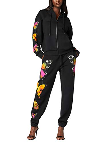 ORANDESIGNE Felpa con Cappuccio da Donna Manica Lunga con Stampa a Farfalla Tute Sportive da Fitness Pantaloni Sciolto Casual in 2 Pezzi Set Primavera Autunno A Nero XS