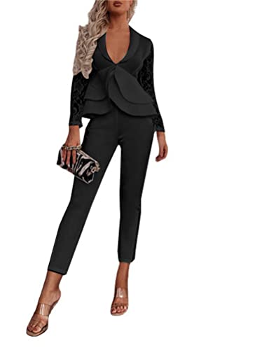 ORANDESIGNE Tailleur Donna Pantaloni e Giacca Elegante Set 2 Pezzi Pizzo Blazer a Maniche Lunghe + Pantaloni a Suit Moda Business OL Formale per Ufficio 01-Nero 3XL