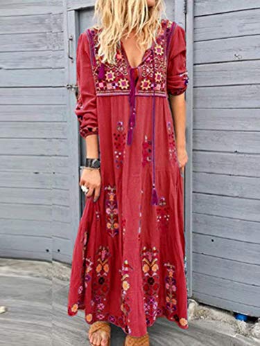 ORANDESIGNE Vestito Lungo Elegante Donna Cerimonia Abito Manica Lunga Vestiti Ricamo Floreale Scollo a V Mode Bohemian Abiti da Spiaggia Sera Cocktail Boho Maxi Dress A Rosso 40