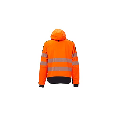 tasca porta cellulare su petto con chiusura zip, cappuccio staccabile con zip, maniche preformate, coulisse antimpigliamento regolabile all'interno della tasca, polsini regolabili con velcro e polsini antivento elasticizzato con buco per il pollice