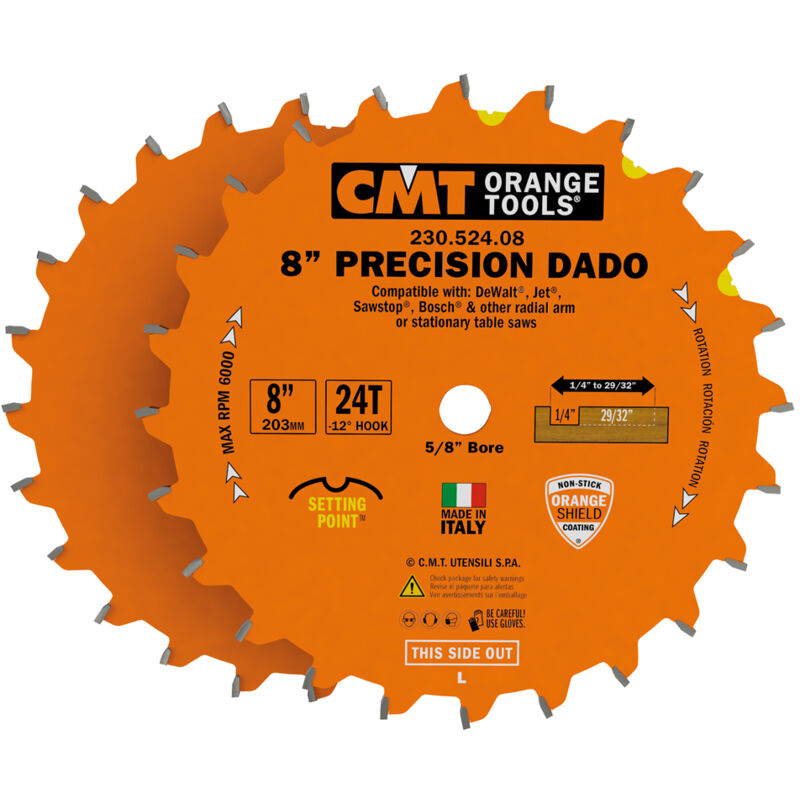 SET LAME X INCASTRI (DADO 8in) HW D206 F=5/8in Z24 FTG+ATB Il set contiene: - 2 lame - 6 lame interne - Set 10 spessori -Design anti-contraccolpo per ridurre l'eventuale sovralimentazione nelle lavorazioni di materiale di massa. -Tagli anti-scheggia su impiallacciati, melaminico e legni duri o morbidi. -Lame interne a 2 o 4 denti che mantengono perfettamente il taglio piano. -Set di spessori per ottenere tagli compresi fra 6,35mm e 22,23mm. Raccomandazioni di sicurezza: utilizzate sempre entrambe le lame esterne. I denti non devono mai entrare a contatto. Il disegno si riferisce alle lame interne. L = Lama sinistra. = Lama destra.