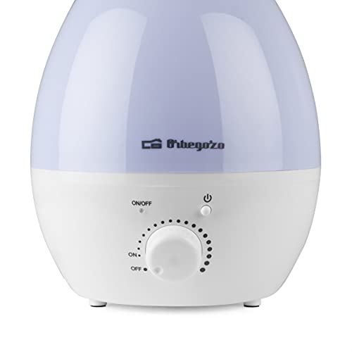 Umidificatore Orbegozo con vassoio per oli aromatici. Design bianco e illuminazione in 7 colori che cambiano automaticamente. Incrementa e regola l'umidità relativa nella stanza