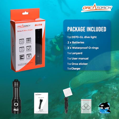 ORCATORCH D570-GL 2 in 1 Scuba Diving Light con 1000 Lumen fascio bianco, 1000 metri di luce verde, per subacquei, istruttori subacquei, subacquei 150 metri