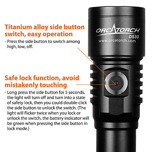 Compatto e potente: OrcaTorch D530 è realizzato in lega di alluminio di alta qualità, il livello massimo di luminosità è fino a 1300 lumen, il che lo rende abbastanza compatto per essere una luce di riserva subacquea, e abbastanza potente per essere una luce primaria di immersione.